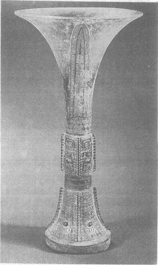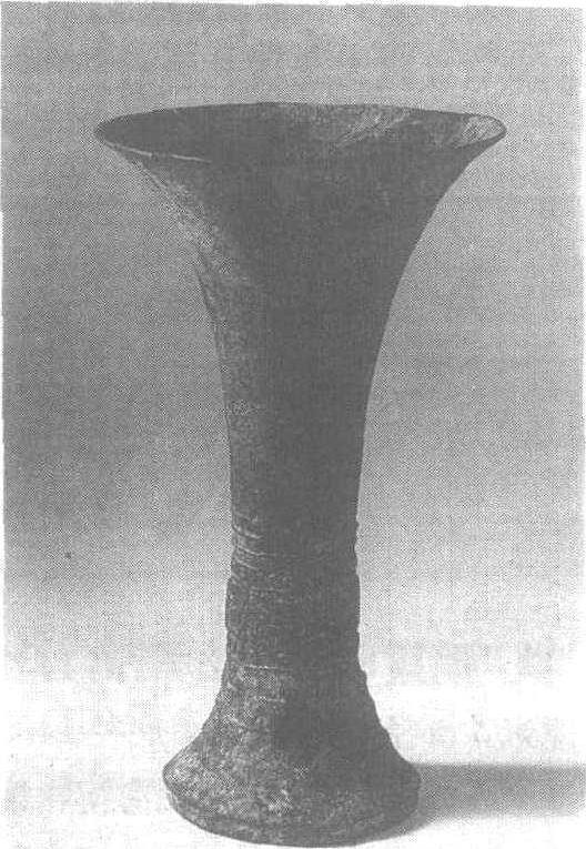 | 释义 | 饕餮纹铜觚商(二里岗期)。饮酒器。高20.7厘米,口径11.7厘米。上海博物馆藏。此觚口部不甚大,颈也不很高,圈足上有大十字孔,研究者认为这是具有实用意义的装饰性设计,因为古人席地而坐,青铜器放置于地上,圈足内容易凝附潮气而致腐蚀,开孔可以起通气流的作用。早期青铜器的圈足上一般都有这样的装饰,晚期的有退化的趋势,这很可能是因为器不放置地上,而另置在较高的地方上的原因。
