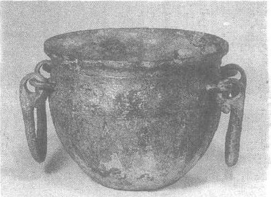 商。高24.7厘米,口径32.4厘米。传1946年河南省安阳市高楼庄出土。北京中国历史博物馆藏。此釜侈口,深腹下敛,平底。口沿下饰饕餮纹带,下为云纹带及垂叶纹。腹两侧有垂环耳,圈系用铆固法,耳上饰三角纹和方格雷纹。此器形制在商青铜器中仅见。
