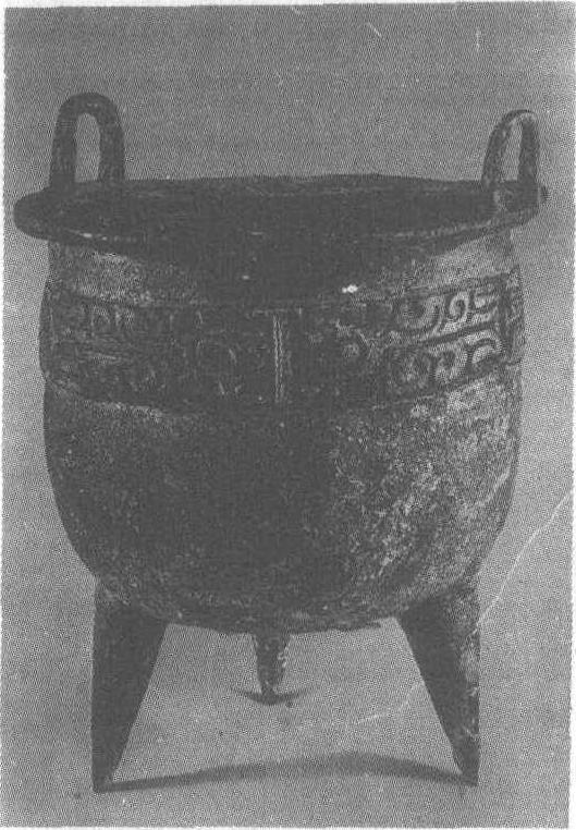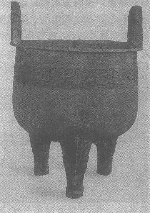 饕餮纹铜鼎西周。炊器,礼器。高24.4厘米。台北历史博物馆藏。圜式鼎,口立环耳一对,腹直,圜底,三柱足。腹壁有扉棱,饰三组饕餮纹,纹饰清晰具雄壮感,空地饰地纹,足饰蝉纹。此鼎为西周前期之器。