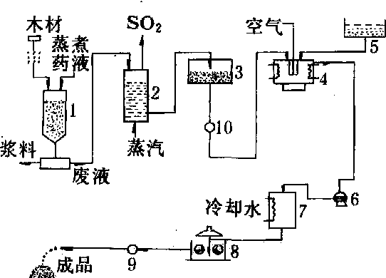 图1 产朊假丝酵母 饲料酵母的加工过程:❶营养液制备,包括去除有害的物质,调整pH值、温度,添加营养盐等; ❷酵母增殖,保持适当的酸碱度和温度,但更重要的是在增殖过程中供给酵母必要的空气(供氧),以利酵母生长所需能量和构成细胞物质; ❸酵母的分离和洗涤; ❹酵母干燥和包装。酵母增殖率高低与发酵罐的性能关系极大。世界上已有多种产率高、能耗低的发酵罐。根据生产经验,糖浓度较低的废液宜采用气提式或喷雾轮式发酵罐。发酵宜采用半连续式工艺(如分割法、流加法等)。用木材水解液或亚硫酸盐浆废液为原料生产饲料酵母,可采用连续化生产的方式。亚硫酸盐浆废液生产饲料酵母工艺见图2。
