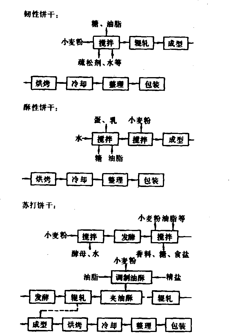 生产工艺 韧性饼干、酥性饼干和苏打饼干的工艺流程如图所示。