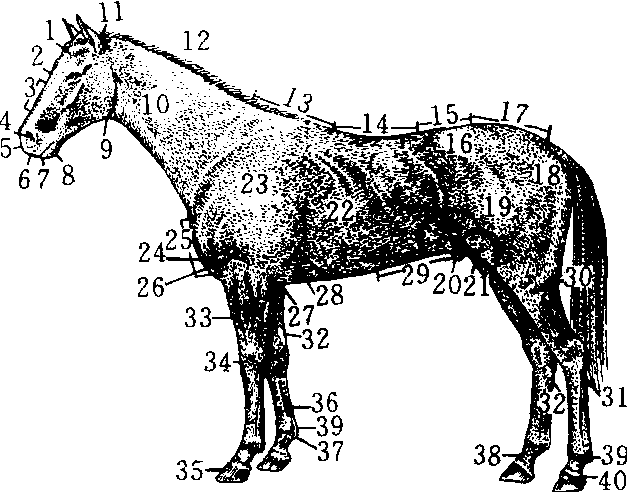 马体部位 1.额 2. 面部 3.鼻梁 4.鼻孔 5. 口笼 6.上唇 7.下唇 8. 颐 9. 喉勒 10. 颈 11. 头顶部 12. 颈嵴 13. 鬐甲部 14. 背部 15.腰部 16.腰角 17. 尻部 18.臀部 19. 大腿 20.胁部 21.后膝关节 22.躯体 23.肩部 24.肩端 25.胸部 26. 臂 27. 肘 28. 带径 29. 腹部 30 . 小腿 31. 飞节 32. 附蝉 33.前臂 34. 膝 35. 蹄 36. 管部 37 . 距 38. 系 39.球节 40.蹄冠 |