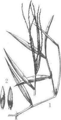 马唐 1.植株 2.小穗(背面及腹面) 马唐一年生草本,高10—80厘米。叶片线状披针形。总状花序,小穗椭圆状披针形。花果期6—9月。产疏勒、莎车、和田等地。是优良牧草。 |
