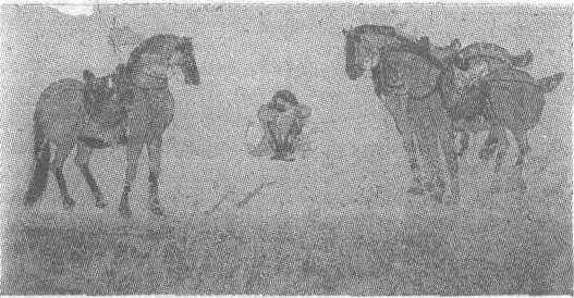 | 释义 | 马夫与马图壁画初唐。纵33厘米,横77厘米。甘肃省敦煌县莫高窟第431窟西壁下层壁画。此为供养人行列的一部分,马夫着裤褶,穿马靴,疲劳之极,手握三匹马的缰绳坐地抱头大睡。三匹膘肥体壮的赭色骏马分立两侧,安静异常,神态中亦露出疲惫。图中人的形态自然写实,生活气息浓厚,三匹马与唐太宗昭陵六骏同一风格,也与唐墓中出土的三彩马颇有相似之处。图中没有自然景物,因透视合理,所以给人以空旷寂静之感。