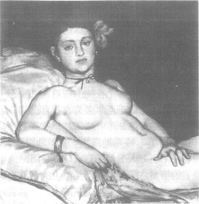 | 释义 | 马奈《奥林匹亚》一位娇小的女人,雪白一身,斜躺在舒适的软床上,带花的披巾滑落一旁。她星眼流眸,直盯着我们。细看她,头上扎着桃红的蝴蝶结,胳膊上戴着配有坠子的金手镯,脚上穿着 一双高跟银边拖鞋。此时一位黑人女佣给她送来一束也许是崇拜者的鲜花,床边还有一只猫儿在伸着懒腰。