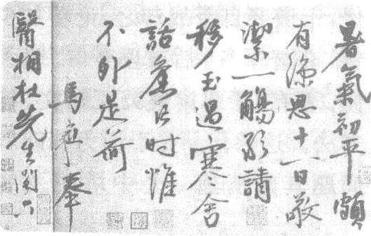 | 释义 | 马愈行书暑气帖明。纸本。纵23.7厘米,横38厘米。曾经明末朱之赤、清安岐、顾崧等人收藏,现藏北京故宫博物院。马愈,字抑之,号华发仙人,人号“马清痴”,嘉定(今属上海市)人。天顺八年(公元1464年)进士,官至刑部主事。能诗文。工山水,与杜琼、刘珏齐名。善书法。此件行书作品是问候类信札,书法骨力挺拔纵逸酣畅,有文人书风。