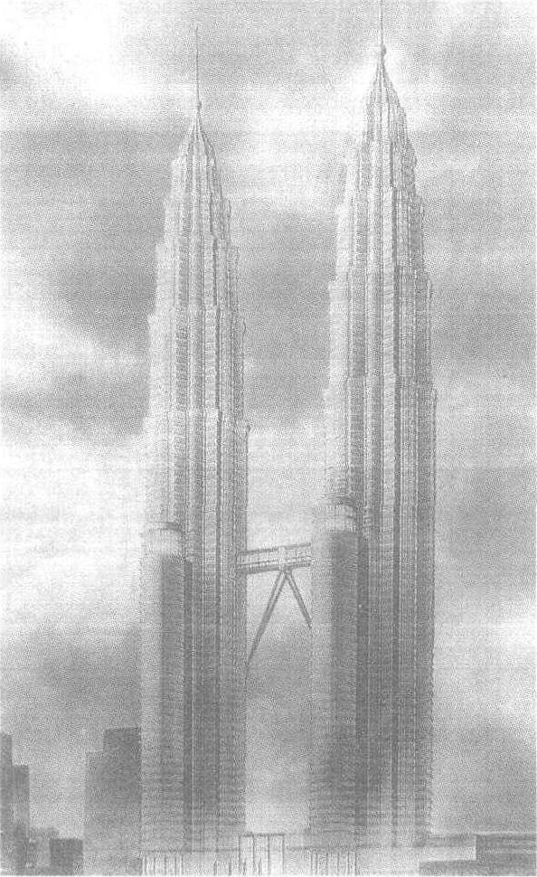 | 释义 | 马来西亚城市中心目前世界最高的大楼之一。位于吉隆坡市中心最繁华的金三角地段,占地约40万m2,包括二栋高455m的双塔大厦,二幢20万m2的写字楼,15万m2的商业和娱乐中心,15000个车位的汽车库,清真寺,20万m2的公园及配套设施组成,总建筑面积约180万m2。双塔大厦总面积约40万m2,地下四层,地上88层,平面为八角形及圆形组合体,分段收缩成高高的塔尖。双塔在41层和42层有一空中天桥相连,桥长58.4m,高9m,宽5m,总重约750吨,连系双塔的空中门厅,桥与双塔用轴承支撑,当双塔随风摆动时,桥可随意收缩。大厦共有24部电梯分段设置,大厦外层材料采用不锈钢和玻璃。高耸的多角形塔身收缩成柔和的曲线,既富现代感又具地方特征。