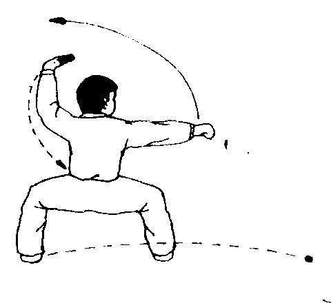 步型拳动作之三。为马步与架打同时完成的基本动作。教学重点 强调上步后两脚平行外撑的同时拧腰上架和冲拳。