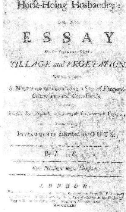 《马耕农法》书影 依次为:植物形态、营养及栽培(1~4章),施肥、整地、除草(5~7章),犁、犁耕及条播等(17~20章)。全书的内容是倡导以马力条播中耕为特点的新式农法,即通称的塔尔农法(Tull System Husbandary)。塔尔认为植物的营养物质是由土壤微粒子构成的,因而及时碎土可不施肥而仍能维持并增进地力,他提倡用马来中耕就是基于这个原因。针对当时的撒播陋习,他主张推行条播,为此他创制了条播机。为提高种子萌发率并减少播种过程中的损失,播种机上装置了特制的种子箱。为此改变撒播平种为起垄条播,这样作物株数虽有所减少,但每棵作物能有较多的生长空间,净产量有可能增加。为了用碎土代替施肥而要求经常锄地,为提高锄地效率提出应当用马作役畜,创制畜力中耕犁(hoeplough)。这一中耕碎土除去杂草的设想,有益于作物田间生长,对于改变中世纪以来的粗放农业,推动当时的农业生产起到了积极作用。《马耕农法》HorseDraught Farming亦译马拉农业。塔尔(J.Tull,1674~1741)著。1733年在伦敦出版,副题是《试论耕作与植物生育的原理》。作者是近代农学奠基人之一,曾创制条播机,并提倡中耕,书中着重论述了这方面的问题。全书共7章,前5章分析植物营养的器官及机制,后2章论述耕作的作用及措施,提倡用马及其他牲畜牵引播种机进行条播,并以畜力中耕。 |