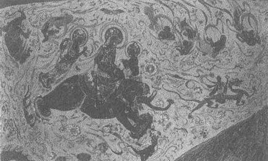 | 释义 | 乘象入胎图壁画初唐。纵175厘米,横210厘米。甘肃省敦煌县莫高窟第329窟西壁龛顶北侧壁画。此图描写菩萨乘六牙白象,自兜率天下降到尼波罗国城主净饭王宫中,于摩耶夫人腹中投胎的情节。此为释迦牟尼著名的生平事迹之一,早在北魏莫高窟壁画中即有这个题材的作品,随着时间的推移,形象越来越完美。图中菩萨头戴宝冠,斜披天衣,翘脚坐于象背。大象所踏的莲花由飞天承托。白象前有乘龙仙人导引,伎乐飞天在其周围欢快地奏乐,散花。飞天扬起的衣带,旋转的天花及流荡的云气,使整个画面热闹非凡,仙气升腾。