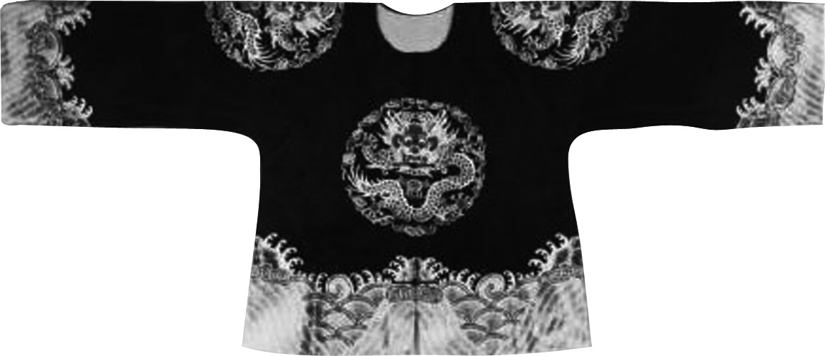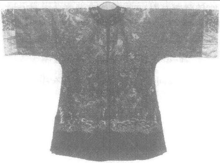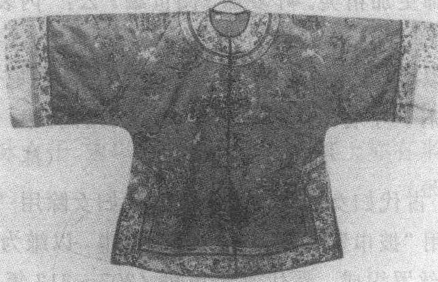 黑团龙马褂 马褂清时流行的一种褂子。清代褂子形似背心,唯多穿在袍服之外,所以也叫“外褂”。其中有一种褂子,长不过腰,袖仅掩肘,短衣短袖便于骑马,所以被称为“马褂”。清初为营兵所服,名 “得胜褂”; 以后不分男女与忙闲,都可穿着,成为一种便服,以致渐渐地成为一种礼服。马褂的颜色,初尚天蓝,乾隆年间用玫瑰紫。以后,由于福文襄王好着深绛色,人争效之,谓之“福色”。马褂的种类很多,以黄马褂为贵,非特赐不得服。其制有大襟、对襟和缺襟之别。对襟马褂多用作礼服;大襟马褂,多用作常服;缺襟马褂,制如缺襟袍,在右襟裁下一块,滚上缘边,然后再用纽扣绾住,又叫“琵琶襟马褂”,也用做行装。马褂的质料,除用绸缎等织物外,也有用各种兽皮的。乾隆年间,还有人将马褂反穿,露皮于外,但多为达官贵人所穿。清末,还流行过一种黑色海虎绒马褂,穿时衬以湖色春纱直行袍,为缙绅阔老的时髦服饰。