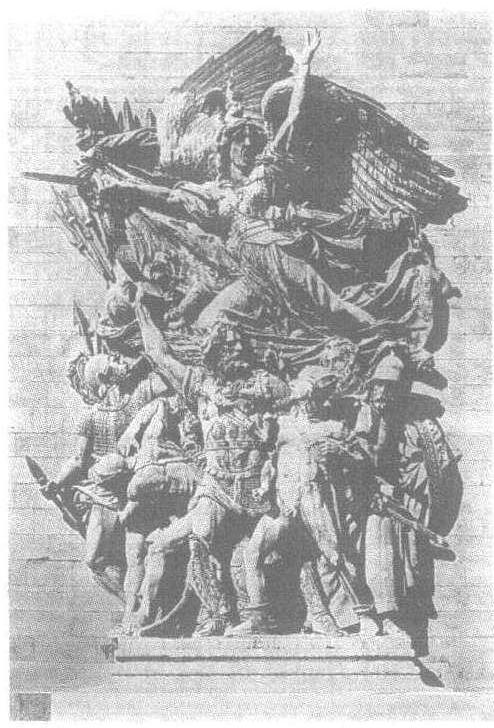 | 释义 | 马赛曲法国歌曲。诗人兼作曲家鲁热·德利勒写于1792年法国大革命时。原名“莱茵军战歌”。大革命中,巴黎人民攻占巴士底狱后,于1792年遭到奥国联军的武装入侵。位于战争前沿阵地的斯特拉斯堡市市长,号召谱写并亲自演唱了这首战斗的进行曲。同年夏天,马赛市人民又高唱它,开进巴黎。从此被誉为《马赛曲》。1870年被定为法国国歌。它传遍欧洲,成为革命的象征。歌词爱憎分明,具有号召力,使人置身于严峻的战火中:“前进祖国的儿郎,光荣的时刻已来临,专制暴政在压迫着我们,我们的祖国鲜血遍地。”……“公民们武装起来!投入战斗;前进,万众一心,把敌人消灭净!”全曲为G大调,4/4节拍,进行曲风格,坚定有力。是分节歌形式。曲调由同主音大小调构成,这种转调手法,在法国革命歌曲中经常使用。 马赛曲《马赛曲》是巴黎爱德华广场凯旋门上的装饰浮雕之 一,为19世纪法国浪漫主义雕塑家吕德(1784~1855年)所作,完成于1836年。