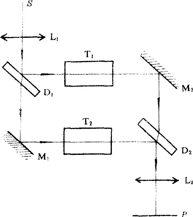 | 释义 | 马赫—秦特干涉仪mahe-qinte gan sheyi一种分振幅双光束干涉仪。由马赫和秦特在1892年研制而成。这种干涉仪的原理如图所示。D1和D2为两块分光板,M1和M2为两块平面镜,这四个反射面接近平行,而且它们的中心分别位于一个平行四边形的四个顶点。单色点光源S位于准直透镜L1的前焦面上,S发出的光通过L1后成为平行光,在D1的前表面分成反射光和透射光。反射光被M2反射,透过D2,射向物镜L2;透射光被M1和D2反射,也射向L2。两束光在L2的后焦面P相遇,产生干涉。测量时,将M2和D2稍作倾斜,使视场内只出现几条等距直条纹。这种干涉仪主要用来研究空洞中飞机或导弹模型周围的气流分布。风洞T1和补偿气室T2分别置于两条光路中,气流高速流过风洞中的模型,气流的速度分布形成压力分布,从而影响密度分布,使折射率出现变化,光线的光程也因此发生变化,使干涉条纹也出现变化。根据干涉条纹的照片,就可分析气流的分布。与迈克耳孙干涉仪相比,马赫-秦特干涉仪的光能利用率较高,光只通过每条路径一次,可使干涉条纹位于模型所在的平面上,从而准确定出条纹的位置。若使用激光作光源,还可获得清晰而明亮的干涉图样。