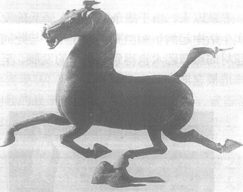 马踏飞燕 武威地处河西走廊东段,是西汉以来汉王朝和匈奴争夺的要冲。汉武帝击败匈奴以后,于公元前121年在这里设凉州郡,从此武威成为具有战略意义的军事重镇。边关多武将,武将都爱马。这种习尚是特定的历史和生活环境所造成的。马踏飞燕的墓主张君,是位统帅千人的军事首领,这件奔马和大量的车骑、武士俑的出土反映了这位战将生前的戎马生涯和爱马的尚武精神。 和该墓其他兵马仪仗俑不同,马踏飞燕是带有独立意义的圆雕作品,尽管它的体量不大,但无论从哪个角度观察,都有着一种非凡的气势。它三足腾空,一足踏着低飞的燕雀,昂首扬尾,在长空中嘶鸣,宛如天马行空、风驰电掣。作者通过对骏马腾空超越飞燕的瞬间描写,表现了战马一往无前所向披靡的战斗精神,给人 一种激越向上的力量。作品的成功首先在于非同凡俗的构思,作者没有特意描绘战马飞腾的速度,而是借助奔马和飞燕体量、动势的强烈对比,烘托、强调了主体,给人留下了强烈的印象。此外,作者对于马的奔腾之势的把握以及对于内在精神气质的表现,都达到了空前未有的新高度。 |