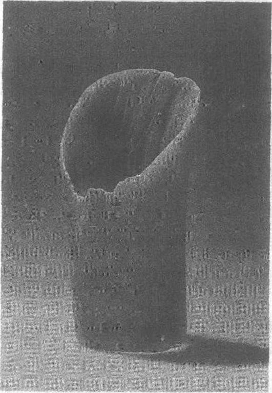 | 释义 | 马蹄形玉器新石器时代红山文化。高18.7厘米,上口径8—11厘米,下口径6.5—8厘米。辽宁省凌源县三官甸子墓葬出土。辽宁省博物馆藏。此器以青玉料(带黑色斑点)琢成,器形为椭圆形筒状。下端口较小,口沿平齐,上端口较大,口沿呈斜面形并琢磨成刃,形制似马蹄状。平齐的一端口沿下部有两个小圆孔。筒内有斜道阴线琢痕,筒外为素面。红山文化遗址中曾多次发现此类玉器,对其用途有以下说法:1.因孔径大,可套于手臂,做护臂器;2.上端有刃,并有使用痕迹,是一种工具式武器;3.下端有孔可穿绳悬挂,是一种乐器。以上说法均是推测,要证实这种红山文化特有玉器的真正用途,还有待于今后发现更多的考古资料。红山文化见“双兽首三孔玉器”条目。