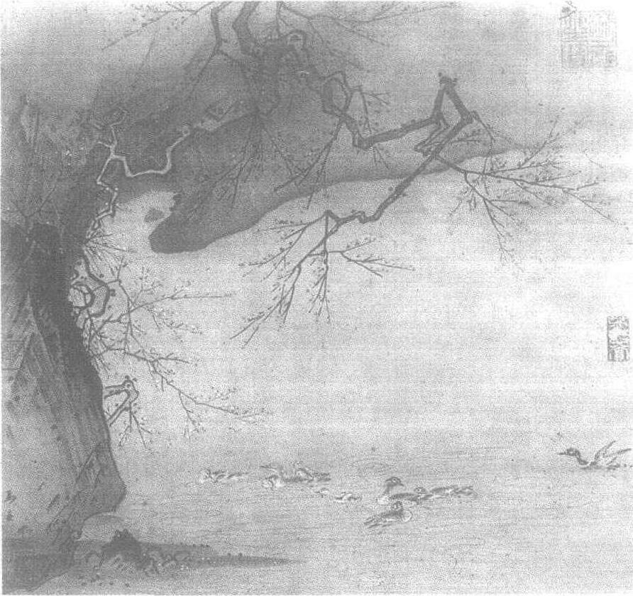 马远《梅石溪凫图》 此卷在艺术处理上颇具特色。近景山石以浓墨大斧劈勾皴点染; 中景坡石则以淡墨勾染,与背景的空白构成深远开阔的空间意境。梅树枝用双勾,梅瓣用色点,洒脱清新; 野凫用笔最为细密工巧,但并无滞板、卖弄之感,而与石、梅、水的浓重泼辣的风格相对比,使画面更有意味。 |