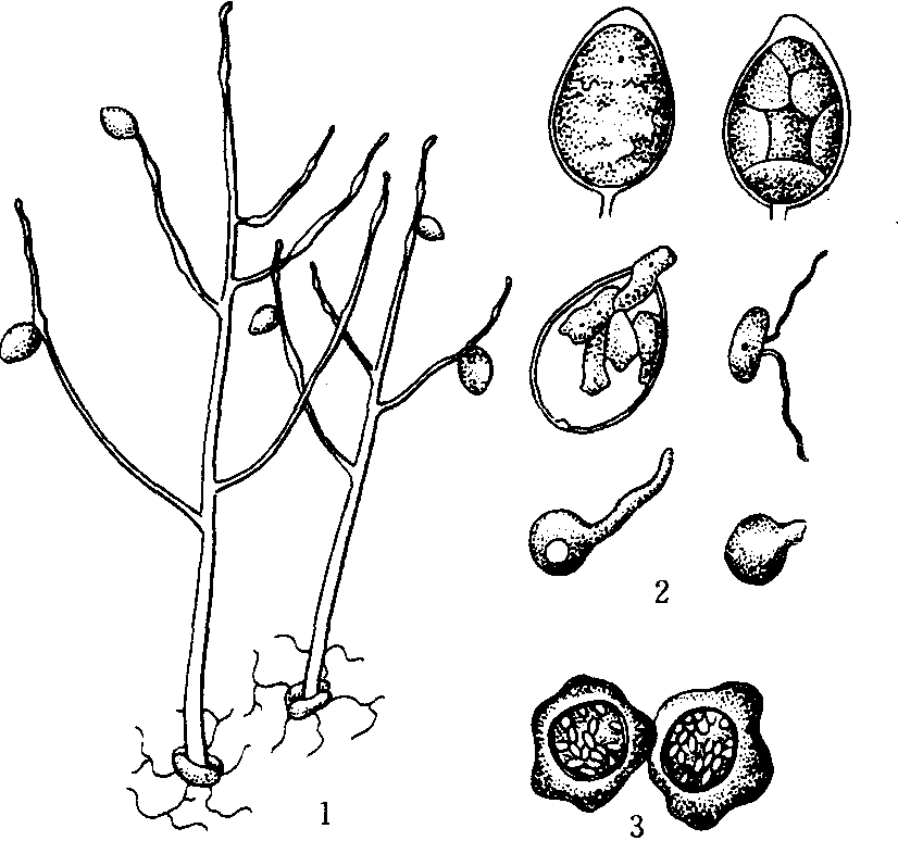 侵染过程和病害循环 病菌以休止孢子萌发的芽管从气孔或表皮侵入,在寄主细胞间隙中发展成菌丝,以吸器伸进细胞内吸取养分。致病疫霉除卵孢子外不能在土壤或病残组织中长期存活和耐严冬的低温,但有形成厚垣孢子存活3个月的报道。在一年一作地区冬季漫长,晚疫病的初侵染源为发病而不严重的薯块,收藏入窖而越冬。来年的和健薯一起播种到地里,病菌随温度转暖而活动,沿着幼苗的茎秆长到地面。气候温暖潮湿在地上或地下的病斑上长出孢子囊侵染叶片与邻近的健苗,经过几次再侵染形成一定数量的病株病叶后成为发病中心才被发现。此时若气候继续潮湿,短期内全田发病。西南地区由于冬季较温暖和有马铃薯植株存在,且多雨潮湿,加上有垂直分布的多种种植制,晚疫病能在早期发生,侵染源不限于本田的病薯。晚疫病的流行主要由温湿度是否适宜与持续时间的长短及品种的抗病性而定。据1951~1961年11年中国张家口地区的资料统计,发病严重的6年中,6、7、8三个月的降雨在200毫米以上,而且连续三年旬相对湿度达到75%以上,高湿旬次数愈多,病害愈严重。病菌传播距离主要在初侵染源附近,但不排除少数能传到几公里以外。 病害控制 马铃薯晚疫病的防治应采取以农业防治、加强栽培管理和药剂保护相结合的措施,主要有三方面。❶选用抗病品种。中国已育出上百个抗病品种,大大减轻了晚疫病的威胁。 ❷减少菌源。首先要从无病留种开始。留种田除严格进行化学保护外,还应增高培土,注意排水,防止病菌随雨水渗入土中侵染新薯。提倡割蔓晒地两个星期后收获,在入窖、播种前淘汰并处理好病薯。 ❸化学保护。根据气象条件和发病中心的出现进行晚疫病流行的预测预报,及时对发病中心附近及低洼地进行化学防治,逐步扩大范围。喷药次数因药剂种类和气象条件而定。药剂种类有波尔多液、代森锌、代森铵等保护剂和内吸杀菌剂瑞毒霉等。 马铃薯晚疫病由致病疫霉菌(Phytophthora in-festans)侵染引起。主要危害叶和块茎。叶部常发生在叶尖或叶缘,开始呈水渍状小斑,后扩大呈圆形或半圆形暗绿或褐色病斑,且病健交界处有白色稀疏的霉轮,叶背尤明显。天气潮湿扩展迅速,受害块茎表面呈淡褐或灰紫色微凹陷的不规则病斑,病斑下面的薯肉呈深度不同的褐色坏死部分。在适温下,温度越高,孢子囊形成越多。防治方法:选用抗病品种;利用早熟品种可以避病;在田间出现中心病株后,及时喷药延缓病害的蔓延。 马铃薯晚疫病potato late blight马铃薯的一种重要真菌病害。广泛分布于世界主要马铃薯产区。病原菌是鞭毛菌亚门的致病疫霉菌〔Phytophthora in-festans(Mont.)de Bary〕。危害叶、茎和块茎。病叶初现水渍状小斑,后扩大为褐色病斑,田间湿度大时变成黑色湿腐,病斑和健康部分的界限不明显,周围黄绿色,叶背病斑产生白色霉层(孢囊梗及孢子囊)。有时病斑扩展到叶柄和茎秆上。病薯表面出现褐色或紫褐色凹陷病斑。土壤潮湿时病斑可深入内部,干燥时表面病斑变硬。病菌也侵害番茄的叶和果实。病菌寄生专化性强,可划分成许多生理小种。病菌主要以菌丝体在病薯内越冬。病薯播种后可在田间形成中心病株,产生孢子囊借气流和水流传播并不断再侵染。潮湿、凉爽、多雾、多露或阴雨天气有利于病害蔓延。品种间抗病性差异明显。可采取选用抗病品种、种植无病种薯和喷洒菌剂等防治措施。
