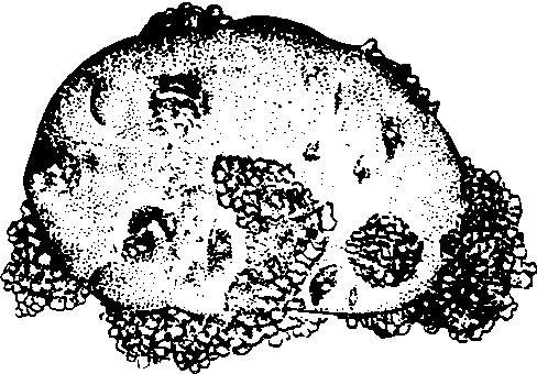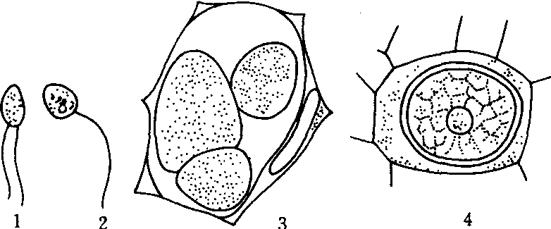 图1 马铃薯癌肿病症状 病因 病原物为内生集壶菌[Synchytrium en-dobioticum (Schulb.) Per.](图2),属鞭毛菌、壶菌目。该菌无菌丝体,在寄主细胞内形成孢子囊。游动孢子和配子具单鞭毛,卵形或梨形,直径1.5~2.2微米。夏孢子囊堆壁薄,卵形或球形,直径47×100~72×81(微米)。夏孢子囊或配子囊薄壁淡色,卵形或多角形,直径25×38~62×87(微米),耐低温、干燥和较强的酸碱度(pH值3.9~10.5)。低温、高湿和土层通透性好有利于孢子囊的萌发。该菌寄主除马铃薯外,尚有番茄、欧白英(Solanum duleamara)、龙葵(Solanum nigrum)及假酸浆属(Nicandra)、酸浆属(Physalis)的一些种。人工接种也可感染茄科及曼陀罗属(Datura)植物。1942~1978年欧洲先后鉴定出13个生理小种或生物型。