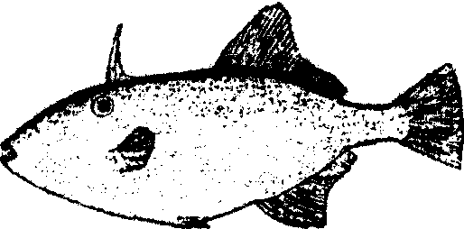图279 马面鲀 马面鲀硬骨鱼纲鲀形目草鲀科马面鲀属鱼类,又称剥皮鱼。20世纪80年代以来居中国海洋捕捞量第2位的鱼类。体为长椭圆形,长约12~22 cm。上、下颌有牙分别为2行和1行。背鳍2个,体蓝灰色。寿命不超过10龄。常栖息于水深50~120 m的海域。每年产卵期为3~5月,受精卵在17℃水温下孵化约需70 h。初生仔鱼体长不足2 mm。中国年产量为40万~50万t。营养价值极高,可食用及作饲料。 |