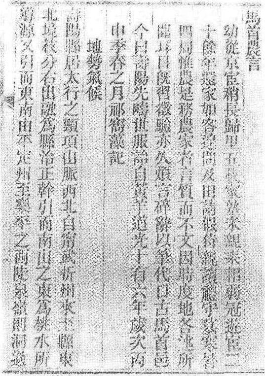 | 释义 | 125 马首农言清山西寿阳人祁寯藻撰。成书于1836年。“马首”系寿阳的古名。书中所记的是当地的农业情况,所以题了这一书名。书中概述了当地地势、气候,分述了种植、农器、农谚、方言、五谷病、粮价物价、水利、畜牧、备荒、纺织等。内容具体切实,对当地实际生产有很大的指导意义。本书所辑的农谚极为翔实,所记载的作物病害种类也是历代农书中最多的。 《马首农言》Agricultur e of Mashou County记述清代山西寿阳县农业生产技术的地方性农书。著者祁寯藻(1793~1866),字春圃,号观斋,山西寿阳县平舒村人。曾任兵部、户部、吏部、工部、礼部的侍郎或尚书及左都御史、军机大臣等职。道光十六年(1836)撰写了该书。因寿阳古名马首,所以取名为《马首农言》。内容包括地势气候、种植、农器、农谚、占验、方言、五谷病、粮价物价、水利、畜牧、备荒、祠礼、织事、杂说等14篇。种植一篇是全书的精华,忠实地记载了当时寿阳县的作物种性、耕作方式和轮作栽培技术。其中前半部分是作者在得到邑人张耀垣“种植诸法”后,与友人冀君乾详细参考,并向农民请教,认为确实无误后,才写成的。此外,该书特辟农谚专篇,收录当地农谚200余条,其他各篇也多引用农谚说明事理,这在传统农书中是罕见的。粮价物价一篇,记载了不少当时当地的物价状况,是农业经济史研究的宝贵资料。方言、祠礼、杂说等篇虽与农业技术没有直接关系,但对方言、民俗和地方史研究,具有一定的参考价值。初版于咸丰五年(1855,见图)。1957年王毓瑚把本书收入《秦晋农言》中,由中华书局出版。