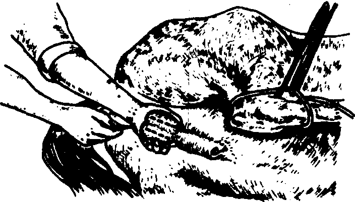 图2 固定睾丸的方法(虚线为切口位置) 以上为基本手术方法。还可根据实际情况, 采取不同措施。在刮挫精索时,用冷水冲洗阴囊腔及精索,以防止出血者, 称水骟法(刮挫法)。术中把精索拉到一定长度时, 用烙铁烙断精索者, 称火骟法。术中用夹板夹在精索的基部固定, 在夹板上放置腐蚀药物以达到腐蚀目的者, 称药骟法。 还有扎骟法, 是在阴囊颈部,先以毫针针刺精索,再用特制的夹骟棒, 从阴囊颈夹住精索。16个小时左右, 除去夹骟棒, 阴囊睾丸肿胀逐渐脱落。 |