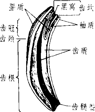 | 释义 | 马齿teeth of horse马的牙齿。由切齿、犬齿和臼齿3类组成。切齿位于上、下颌的最前端,其中位于上颌骨的称为上切齿、位于下颌骨的称为下切齿,上、下切齿各6枚,最中间一对称门齿,最外侧一对称隅齿,位于两者之间的称中间齿。犬齿多生于公马,上、下颌各2枚。臼齿共24枚,在上、下颌的两侧,每侧各6枚;前面3枚称前臼齿,后面3枚称后臼齿。每个牙齿都可分为齿冠、齿颈和齿根三部分。露出齿龈外的称齿冠,被齿龈包埋的称齿颈,位于齿槽内的称齿根。马齿由垩质、釉质、齿质3种物质构成。垩质又称白垩质,位于牙齿的最外层。釉质,又称珐瑯质,位于垩质内面。 齿质,又称象牙质,位于牙齿的最内层,它占据了牙齿组织中的大部分。牙齿的中心部有齿髓腔,腔内含富有血管和神经的齿髓。马的切齿由于不断咀嚼磨损,因而随着年龄的增长在牙面上有不同的变化状态。如齿冠的咀嚼面,由于垩质和釉质陷入齿质内而形成一个漏斗状的凹陷,称为齿坎。齿坎空腔中的垩质因食物残渣酸败腐蚀而发黑,称之黑窝。随着年龄的增长,黑窝逐渐被磨损,以致最后消失,这时在磨损面上所见的釉质轮称为齿坎痕。马驹出生后1~2周起开始长出牙齿,这时的牙齿称为乳齿。至2.5岁时开始换牙,新长出的牙齿称为恒齿,也称永久齿。
