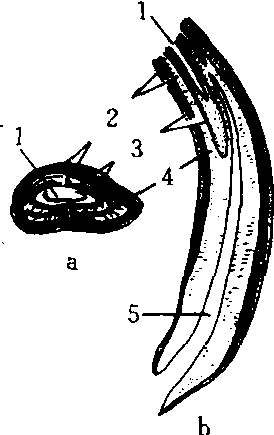 1. 齿坎 2. 骨质 3. 釉质 4. 牙质 5.齿髓腔