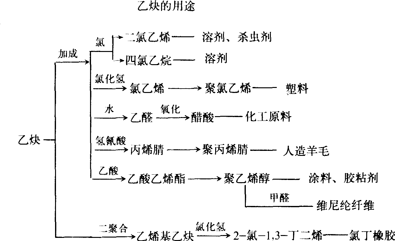 | 释义 | 乙炔yique化学式HC≡CH,属最简单的炔烃,俗称电石气。纯品为无色略带芳香气味的气体,自电石制取的乙炔含有磷化氢、砷化氢、硫化氢等杂质而具有特殊的刺激性蒜臭和毒性; 常压下不能液化,升华点为-83.8℃,在1.19×105Pa压力下,熔点为-81℃; 易燃易爆,空气中爆炸极限很宽,为2.5%~80%; 难溶于水,易溶于石油醚、乙醇、苯等有机溶剂,在丙酮中溶解度极大,在 1.2MPa下,1体积丙酮可以溶解300体积乙炔,液态乙炔稍受震动就会爆炸,工业上在钢筒内盛满丙酮浸透的多孔物质 (如石棉、硅藻土、软木等),在 1~1.2MPa 下将乙炔压入丙酮,安全贮运。
