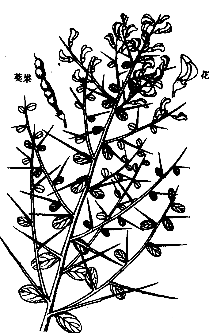 骆驼刺 骆驼刺manaplant alhagiAlhagi pseudoalhagiDesv.,豆科,骆驼刺属。落叶多刺小灌木。小枝灰绿色,枝刺长1.2~2.5 cm。单叶,倒卵形或长圆形,长0.5~3 cm,全缘,两面被平伏柔毛,托叶钻形、宿存。总状花序腋生,花序轴刺状,3~8花;花冠紫红色;雄蕊两体(9+1)。荚果镰形、念珠状,长达3cm,红褐色。种子1~6。分布于新疆、甘肃、内蒙古等省区。哈萨克斯坦、蒙古也有分布。喜光。耐盐碱、耐干旱。深根性,在戈壁滩上,根系深达20 m。为重要固沙树种,可防止流沙或沙丘移动。为骆驼和羊的优良饲料,花期含粗蛋白11%~13%。种子含油量约8%。叶浸剂可发汗、利尿。花为优良蜜源。可作绿篱。 骆驼刺别名刺糖。多年生草本,高40—60厘米。茎直立,多分枝。叶互生,长卵形,正面绿色,背面灰白色。花碟形,紫红色。果串球状,种子圆形,棕黑色。全疆有分布,多产于吐鲁番等地。具有滋补强壮、涩肠止痛、清热解毒、消肿止痛的功能。药用全草、种子和分泌物。主治痢疾、腹痛、腹泻、胃脘胀痛、热痢腹痛、口舌生疮、咽喉肿痛、牙痛等病症。 |