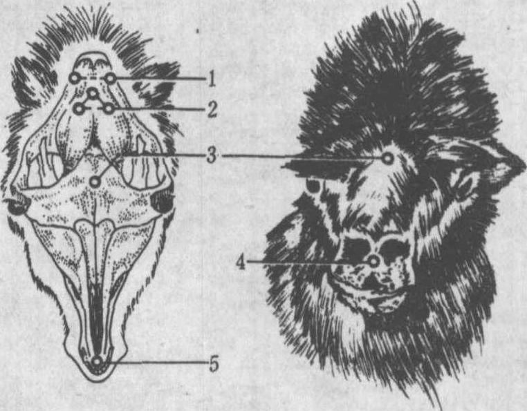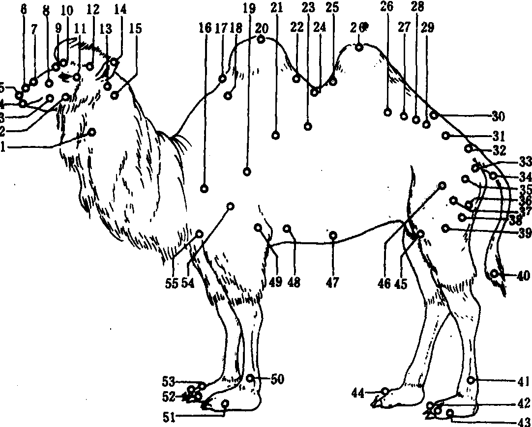 图1 骆驼体表穴位 大风门(dafengmen) 共三穴,中间一穴位于枕嵴前下方约12厘米处的额嵴部,另两穴在正中穴前下方旁开4.5厘米处。火针由上向下平刺入6厘米,或火烙。主治项强腰直或其他风证。 龙会(longhui) 又名通天或顶门。额部正中,两外眼角连线中点的凹陷处,一穴。火烙。主治破伤风、项脊恡、脑黄。 鼻缺(bique) 两鼻孔之间的鼻尖处,一穴。烧烙。主治癫痫。 分水(fenshui) 又名命牙。嘴唇上,两鼻孔下,唇沟正中,一穴。小宽针直刺1.5厘米。主治冷痛、黑汗风。 内唇阴(neichunyin) 上唇粘膜面的血管上,左右侧各一穴。小宽针散刺出血。主治胸痛、心、肺和脾积热。 通关(tongguan) 舌底两侧血管上,左右各一穴。将舌拉出,翻转舌体,用小宽针刺破舌下血管,出血。主治舌疮、心脾肾积热、肚痛。 三江(sanjiang) 内眼角前下方约6厘米处的血管上,左右侧各一穴。小宽针直刺1厘米,出血。主治肚痛、翳膜遮睛、睛生瘀血。 血堂(xuetang) 鼻孔上方、距鼻孔上缘6厘米处,下鼻甲骨部的鼻粘膜上,左右侧各一穴。小宽针刺破下鼻甲骨,主治鼻肿痛。肺热喘粗。 鼻俞(bishu) 又名气海。鼻孔上方3厘米处,左右侧各一穴。小宽针直刺2厘米,出血。主治五脏积热、消化不良。 锁口(suokou) 口角后3厘米处,左右侧各一穴。火针直刺3厘米,或烧烙。主治口眼歪斜、牙关紧闭。 开关(kaiguan) 口角后上方的咬肌前缘凹陷中,左右侧各一穴。火针直刺3厘米,或烧烙。主治口眼歪斜、牙关紧闭。 眼脉(yanmai) 外眼角后下方6厘米处的血管上,左右侧各一穴。小宽针或中宽针顺血管刺入1厘米,出血。主治肝经风热、睛生翳膜。 大眼角(dayanjiao) 内眼角内,第三眼睑内侧凹陷中。左右侧各一穴。毫针或圆利针向内下方刺入2~3厘米。主治眼病、肚痛。 骨眼(guyan) 内眼角内,第三眼睑的外上缘,左右侧各一穴。小宽针刺破第三眼睑,或沿外上缘剪去一小部分。主治肝经风热、闪骨生瘀。 睛明(jingming) 内眼角下的外侧皮肤褶上,即在下眼睑的泪骨上缘凹陷处,左右侧各一穴。小圆利针直刺1厘米,或在下眼睑内侧粘膜部点刺出血。主治流泪、眼内生疮。 耳尖(erjian) 耳的尖端,左右耳各一穴。小宽针直刺1厘米。主治肚痛、感冒、头肿、耳内生疮。 耳姜牙(erjiangya) 耳根前方的盾状软骨上,左右侧各一穴。小宽针刺透软骨。主治肚痛、消化不良。 风门(fengmen) 又名小风门。耳后下方1.5厘米,寰椎翼前缘的凹陷处,左右侧各一穴。火针向下直刺1~2厘米。主治破伤风、脑黄、项脊恡。 伏兔(futu) 耳后寰椎翼后上缘的凹陷中,左右侧各一穴。火针直刺3厘米。主治破伤风、脑黄、项脊恡。 九委(jiuwei) 分为上上委、上中委、上下委、中上委、中中委、中下委、下上委、下中委、下下委等九穴。上上委在鬣毛下项韧带下方,距耳后9厘米处;下下委在肩胛软骨前角前4.5厘米处;两穴之间划分成8等份,即为其余七穴,左右侧各九穴。火针直刺3厘米。主治项脊恡。 鹘脉(gumai) 又名颈脉。下颌骨颈角后缘约7厘米处的颈静脉上, 左右侧各一穴。大宽针顺血管刺入1厘米, 出血。主治脏腑积热。 嗓黄(sanghuang) 颈下气管腹侧部正中第二、三气管轮之间, 一穴。小宽针穿过, 或由两侧各刺入1厘米。主治嗓黄。