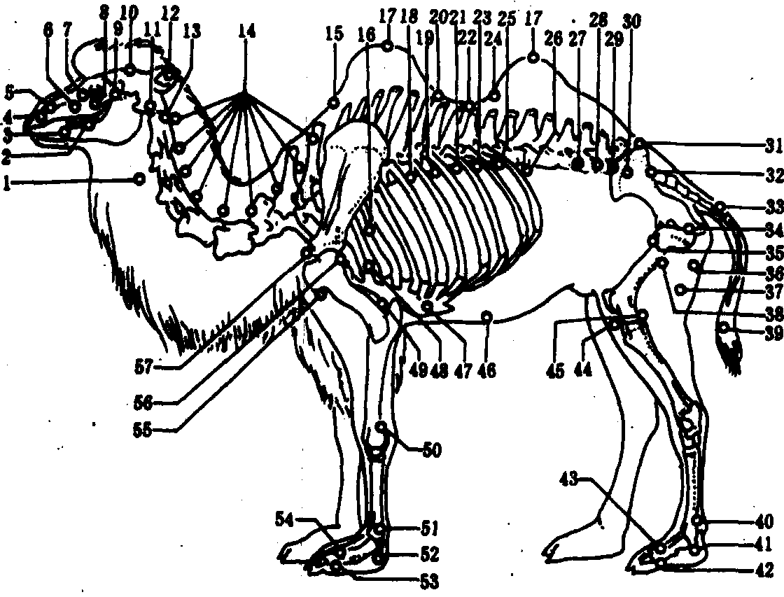 图2 骆驼的骨骼及穴位 前峰(qianfeng) 前峰正前基部的凹陷处, 一穴。火针或圆利针直刺3厦米, 毫针直刺6厘米。主治项脊恡、前肢风湿。 峰尖(fengjian) 峰顶端的脂肪结缔组织内, 前、后峰各一穴。火针或小宽针直刺3~6厘米。主治水囊积热、不食。 丹田(dantian) 由两峰中间处向前数的第二个凹陷处, 刺入第八与第九胸椎棘突之间, 一穴。火针直刺3厘米。主治肚痛、腰风湿。 脊俞(jishu) 两峰正中间的凹陷中,一穴, 即在第十与第十一胸椎棘突之间。火针直刺1.6厘米,小宽针直刺3厘米。主治腰胯疼痛、风湿症。 带脉(daimai) 胸侧壁, 肘后6厘米处的胸外静脉上, 左右侧各一穴。中宽针顺血管直刺1厘米, 出血。主治脾经积热、肠黄、消化不良。 云门(yunmen) 脐前3厘米,距白线旁约1.5厘米处, 左右侧各一穴。大宽针刺破皮肤, 向上插入宿水管。主治宿水停脐。 肺俞(feishu) 倒数第五肋间, 距脊梁约24厘米处,髂肋肌沟中,左右侧各一穴。火针直刺3厘米。主治肺痛、肺寒、咳嗽。 肝俞(ganshu) 倒数第四肋间、距脊梁约24厘米处, 髂肋肌沟中, 左右侧各一穴。火针或圆利针直刺3厘米。主治黄疸、肝虚、眼病、脾胃虚弱。 脾俞(pishu) 倒数第三肋间、距脊梁约24厘米处, 髂肋肌沟中, 左右侧各一穴。火针或圆利针直刺3厘米。主治脾寒、肚痛、肚胀、慢草。 胃俞(weishu) 倒数第二肋间,距脊梁约24厘米处, 髂肋肌沟中, 左右侧各一穴。火针或圆利针直刺3厘米。主治脾胃虚弱、积食、泄泻、腹痛。 大肠俞(dachangshu) 倒数第一肋间,距脊梁约24厘米处,即背阔肌深部, 髂肋肌沟中。左右侧各一穴。火针或圆利针直刺3厘米。主治便秘、肚胀、积食、泄泻。 关元俞(guanyuanshu) 第十二肋骨后缘与第一腰椎横突游离端之间。左右侧各一穴。火针或圆利针直刺3厘米。主治便秘、肚胀、积食、泄泻。 膀胱俞(pangguangshu) 第二、三腰椎横突之间的凹陷中, 左右侧各一穴。火针或圆利针向背中线刺入3~4厘米深。主治泄泻、腰肌风湿症。 百会(baihui) 腰椎与荐椎之间的凹陷中,一穴。火针或圆利针直刺4.5~6厘米。主治腰胯风湿拉稀、肚痛、便秘。 肾角(shenjiao) 百会穴前外侧,距背正中线6厘米处, 刺入背最长肌内, 左右侧各一穴。火针或圆利针直刺4.5~6厘米。主治腰风湿、后肢风湿。 肾俞(shenshu) 肾角穴前6厘米处,刺入背最长肌内, 左右侧各一穴。火针直刺4.5~6厘米。主治腰风湿、后肢风湿。 肾棚(shenpeng) 肾俞穴前6厘米处, 刺入背最长肌内, 左右侧各一穴。火针直刺3厘米。主治腰风湿、后肢风湿。 腰后(yaohou) 肾棚穴前6厘米处,刺入背最长肌内,左右侧各一穴。火针直刺3厘米。主治腰风湿、后肢风湿。 次窖(cijiao) 在第一、二荐椎骨间旁开3厘米处,刺向第二荐背孔的荐神经,左右侧各一穴。火针或圆利针直刺3厘米。主治尿闭、腰硬。 后峰(houfeng) 后峰正前基部的凹陷处,一穴。火针或圆利针向后下方刺入3厘米,可达腰椎棘突。主治腰风湿。 尾根(weigen) 荐尾结合部的凹陷处,一穴。火针直刺1.5厘米。主治腰尾风。 尾旁(weipang) 尾根两旁的凹陷中,左右侧各一穴。火针向前下方刺入3厘米。主治闪伤腰胯、腰尾风。 尾本(weiben) 尾根腹侧面正中,距尾根约6厘米处的尾静脉上,一穴。小宽针直刺1厘米,出血。主治肚痛、腰胯痛。 尾尖(weijian) 尾尖端,一穴。小宽针从尾尖向上刺入3厘米,或劈成十字形。主治肚痛、黑汗、感冒。 后海(houhai) 尾根下,肛门上的凹陷中,一穴。火针或圆利针稍向前上方刺入3厘米,毫针6厘米。主治秘结、肚痛、肚胀。 莲花(lianhua) 脱肛时的直肠粘膜处是穴。洗净污物后,剪去疱痂,整理复位。主治脱肛。 膊尖(bojian) 前峰根部的前外侧,肩胛软骨与肩胛骨前角结合部的凹陷中,左右侧各一穴。火针向后下方斜刺4.5厘米。主治膊尖痛、前肢风湿。 膊栏(bolan) 肩胛软骨与肩胛骨后角结合部的凹陷处,左右侧各一穴。火针向前下方斜刺3~4厘米。主治项肌及前肢风湿。 肩井(jianjing) 肩端外侧上缘的凹陷中,左右侧各一穴。火针斜向内下方刺入3厘米,圆利针刺入4.5厘米。主治肩关节肿痛、前肢风湿。 肩俞(jianshu) 肩端下缘陷窝中,左右侧各一穴。火针或圆利针斜向内上方刺入3厘米。主治肩关节肿痛、前肢风湿。 肩外俞(jianwaishu) 肩关节后缘陷窝中,左右侧各一穴。火针或圆利针直刺3~4.5厘米。主治肩关节肿痛、前肢风湿。 抢风(qiangfeng) 肩关节后方12厘米处,肩峰下凹陷中,左右侧各一穴。火针或圆利针直刺4.5厘米,毫针6厘米。主治抢风痛、肩膊闪伤、肩膊风湿。 冲天(chongtian) 抢风穴后上方约10厘米处,臂三头肌长头前缘与三角肌间沟中,左右侧各一穴。火针或圆利针直刺4.5厘米,毫针6厘米。主治肩膊闪伤、抢风痛、肩膊风湿。 胸堂(xiongtang) 胸前两侧的胸外侧沟中的血管上,左右侧各一穴。中宽针顺血管刺入1厘米,出血。主治心经积热、胸膊痛、肩关节挫伤。 夹气(jiaqi) 胸骨两旁的腋窝正中,左右侧各一穴。将患肢向外拉,或将患肢提起保定后,用大宽针刺破皮肤,然后以夹气针向后上方刺入25~30厘米,出针后摇动患肢。主治闪伤夹气。 肘俞(zhoushu) 肘头前下方的凹陷中,左右肢各一穴。火针或圆利针直刺3厘米。主治肘关节扭伤、前肢风湿。 过梁(guoliang) 腕外侧,距副腕骨上缘3厘米的前臂骨后缘凹陷中,左右肢各一穴。圆利针由外侧向对侧刺透。 前缠腕(qianchanwan) 球节上方,掌骨后缘的血管上,左右肢各
