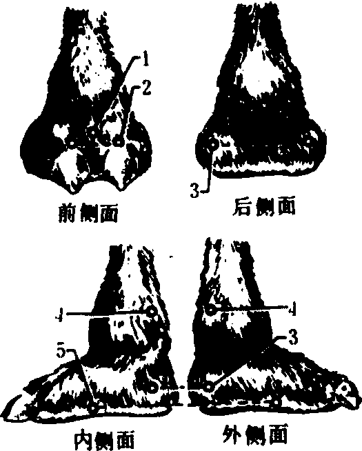 图4 骆驼脚部穴位 注: 1. 涌滴: 前肢称涌泉; 后肢称滴水 2. 蹄夹:前肢称“前蹄夹; 后肢称“后蹄夹”,其余三穴类同 后蹄夹(houti-jia) 蹄叉后3厘米的趾骨窝中, 每蹄内外侧各一穴。小宽针稍向后下方刺入1厘米。主治蹄肿热痛、腿痛。 后蹄门(houti-men) 蹄后窝两侧的小窝中。每蹄内外侧各一穴。小宽针刺入1厘米, 出血。主治蹄肿、抽筋。 后蹄沿(houti-yan) 蹄内外侧中部的有毛与无毛交界处, 每蹄内外侧各一穴。小宽针直刺1~2针, 放出血水。主治蹄肿、蹄漏。 |