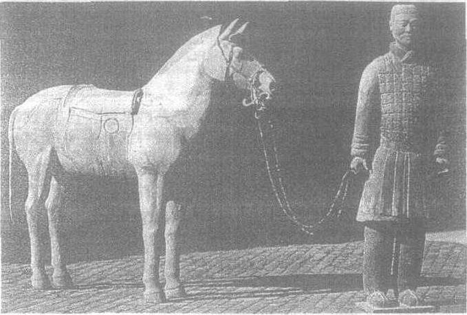 骑兵鞍马俑 这组俑,骑兵高1.80米,鞍马高1.72米,长2.03米,据秦简《秦律杂抄》记载,秦国挑选战马和骑兵非常严格,马高(从髻甲到地面)必须超过5尺8寸(1.33米),骑兵也必须从士兵中优选。实际测量结果表明,秦俑坑出土的坐骑俑通高1.72米,至髻甲高1.33米,与秦简的记载大体相符; 骑士俑也都是1.80米以上的彪形大汉。可以看出,骑兵鞍马俑完全是仿照秦国骑兵塑造的,非常真实地再现了当年秦国铁骑的雄威。 这件骑兵俑,高大结实,呈立正姿势站在鞍马之左,身着战袍、齐腰甲,右手牵马,左手提弓(已朽),为实战装束。这是一位久经沙场的老兵,已处临战状态,他依然那样沉着、坚定,充满了必胜的信心。战士身旁的骏马骠肥体壮,筋骨内含,双目圆瞪,耳如批竹,昂首嘶鸣。作者通过骑兵、战马一静 一动的对比描写,成功地塑造了两个活生生的有血有肉的形象,有呼之欲出之感。秦代匠师在整体设计的种种制约下,在进行类型化创造的同时,也创造了富有个性的艺术形象,应该说是很了不起的。 |
