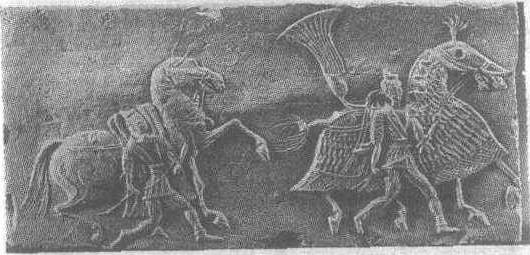| 释义 | 骑士牵马画像砖南朝。高19厘米,宽38厘米,厚6厘米。1958年河南省邓县学庄墓出土。河南省博物馆藏。砖面刻饰两个骑士,各牵一匹战马,一前一后疾走。前边的黑马身披由面帘、鸡颈、当胸、身甲、搭后和寄生等部分组成的白色铠甲,昂首张嘴、阔步前行。后面的紫红马挺颈倾首,长尾拂扬,左前足高高抬起,似欲奔腾,十分生动。整个画面动感颇强。我国骑兵制始设于战国赵武灵王时期。骑兵战马的防护设备,在汉代则只有皮制的“当胸”,到了曹魏时虽开始有马铠,但尚不完全。此图马铠刻画清晰,结构完整,是迄今已发现的我国古代马铠资料最为翔实的一个。砖侧有墨书文字三行,惜已漫溃不清,无法通读,只有“部曲在路日久”、“众十万”、“家居吴郡”等语尚可辨认。