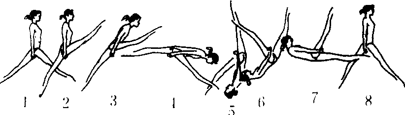 | 释义 | 骑撑前回环骑撑,利用摆腿倒上体围绕单杠向前旋转1周。动作要领:由两手反握杠、右腿在前骑撑开始。直臂顶肩撑杠,同时右腿向前跨出,左大腿前上部靠杠,上体挺直前倒。当身体回环接近杠后水平部位时,右腿向前下方压杠,展髋,左腿继续后摆,同时挺胸、直臂压杠,翻腕上成骑撑。保护与帮助:保护者站在杠后侧方,一手从杠下翻握他的手腕,另一手当练习者回环过杠下垂直部位后,托其背部助其上成骑撑。教学重点:帮助者站在杠前,用手抵住练习者的前脚,使其体会撑杠、向前跨腿、上体前倒技术的配合,然后在帮助下做完整练习。