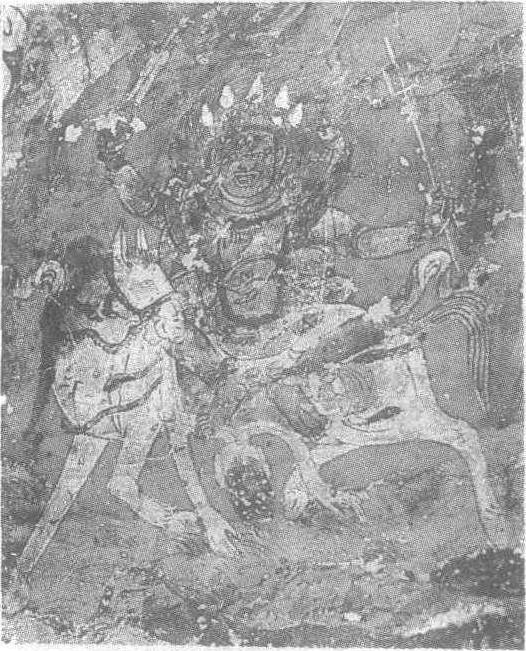 | 释义 | 骡子天王像壁画明。纵40厘米。甘肃省永靖县炳灵寺石窟第128窟东壁门内壁画。佛教密宗经典中记载,骡子天王骑一四眼骡子(胯上左右各有一眼),骡子可以飞行,能走遍天上、地上、地下三界。骡子天王生性残暴,被金刚手降服后成为佛的护法神。图中天王体魄雄健,一手持剑,一手挥戟,横眉怒目,口中发出喝叱,威风凛凛。其胯下的骡子正在迈步奔驰并回首后望,可看出是一匹性格暴烈的牲畜。画面以红色为背景,天王赋以黑褐色,以增添气势;骡子则为白色,为画面增添了亮度。画风具有粗犷豪放之美。