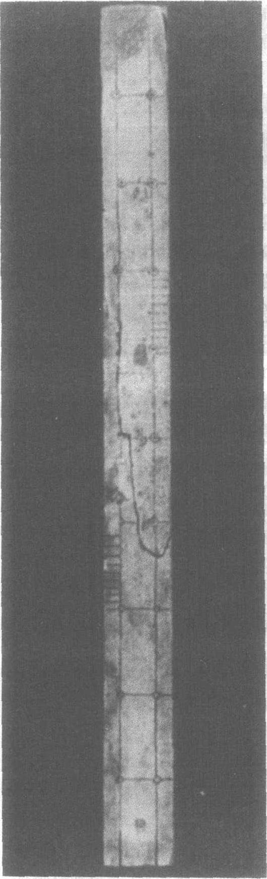 骨尺三国·魏。长23.8厘米,宽1.6厘米,厚0.15厘米。1972年甘肃省嘉峪关新城2号墓出土。甘肃省博物馆藏。尺等分十寸,用两个星圈表示寸,半寸处也有刻度,用一个星圈表示,五寸处中央一个星圈和周围八个星圈组成的圆环作为“尺心”。寸与寸之间的星圈以及每寸之间的星圈用细刻线相贯通。尺端半寸星圈处有一穿孔。
