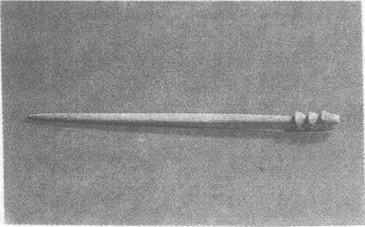 骨簪春秋时代束发用具。1965年沈阳市于洪区郑家洼子墓葬出土,长14.8、直径0.2—0.4厘米,一对上粗下细,尖头圆箸形。这对发簪对研究春秋时代东胡族的结发形式,提供了实物资料。 |
