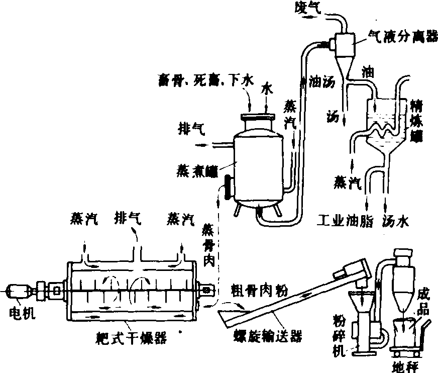 小型骨肉粉加工成套设备简图 工业发达国家的骨粉、肉骨粉生产设备容量较大,品种较多,包括剥皮、去毛、破碎、混合、蒸煮、脱脂、干燥、粉碎、包装等设备,并附有多种空气处理及废水净化的装置,生产过程趋向全封闭,以减少对环境的污染。荷兰一厂家的禽类下脚料加工工艺为: 原料通过清理装置或直接由真空装置送入贮存罐作临时贮存,并由此分批装入蒸煮烘干器,干燥后的粉料排入容器,再由输送器输往包装点进行包装,如脂肪含量高,粉料还需进一步脱脂。 |