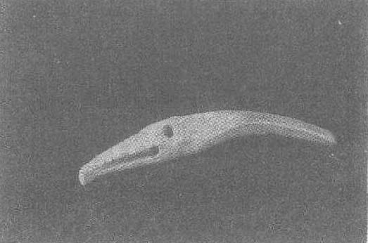新石器时代。长7厘米。1972年黑龙江省兴凯湖地区密山新开流出土。黑龙江省考古工作队藏。鱼鹰首形,呈引颈觅食状。长喙,圆凹眼,细长颈,喙两边对称刻十道浅线代表牙齿。鹰头雕刻得古朴简洁而肖真,是东北地区新石器时代珍贵的雕刻艺术品。