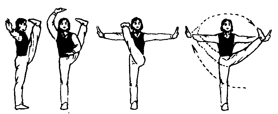 | 释义 | 髋腿练习以髋关节为轴的腿部练习。其主要练习类型有踢、压、耗、摆、劈叉等。踢有正、侧、蹁、十字等。正踢腿:上体正直,两腿伸直,脚踢向眼眉处,落下成直立,根据需要勾脚或蹦脚。(图2—3—3)侧踢脚:脚从身体的侧面踢向耳侧,髋关节充分外展。后踢腿:大腿根用力,上体正直。十字踢脚:脚踢向异侧太阳穴处。蹁腿:右腿向左经上再向右划弧成站立。压腿有正压、侧压、后压等,压腿时被压腿搁置在一定高度的器械上,两腿伸直。正压腿:上体正直前下压、勾脚。侧压腿:背部挺直,上体侧屈下压,不前倾后仰。后压腿:支撑腿直或屈均可,肩要正,上体后屈时挺胸腹。耗腿:是压腿的前奏,把脚放置在一定高度上,两腿伸直,上体正,保持正确的身体姿势静止片刻。摆腿:两手可扶持器械,进行前后、左右的钟摆式摆动。劈叉:分前后劈叉(纵劈叉),左右劈叉(横劈叉)。前后劈叉:两腿伸直前后分,前腿的后部和后腿的前部着地,上体正直下压。左右劈叉:两腿伸直左右侧分,上体正直,压时可前屈。老年人通过以上髋腿练习增强盆带肌、大腿及小腿肌群的弹性和力量,提高髋关节的灵活性和关节周围韧带的柔韧性。由于老年人的生理特点,肌肉和韧带的弹性下降,因此进行髋腿练习时一定要注意身体情况,切不可操之过急,否则容易发生拉伤,甚至撕裂。练习前,要进行适当的活动如慢跑、快走等使身体发热,练习顺序应先耗后压再踢腿,用力由小到大,动作规格由低到高,逐步使动作达到正确要求,取得最佳效果。