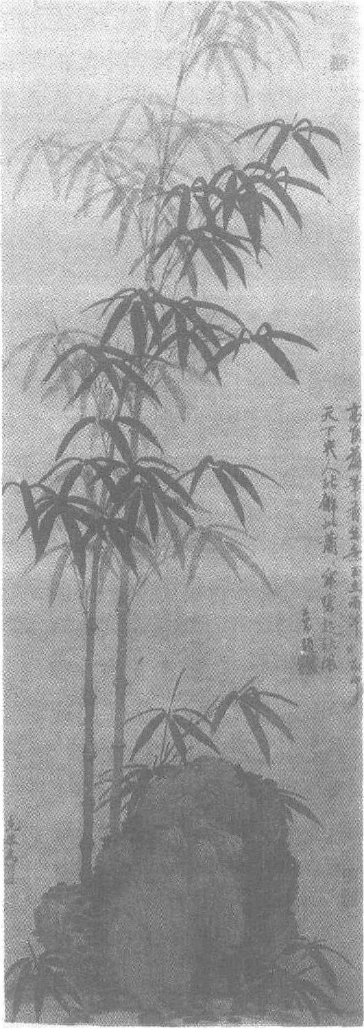 | 释义 | 高克恭墨竹坡石图轴元。高克恭(见《高克恭云横秀岭图轴》条目)绘。纸本墨笔。纵121.6厘米,横42.1厘米。北京故宫博物院藏。此图是高克恭传世的唯一一幅墨竹作品。图中两竿雨竹挺立石间。石体圆浑、厚重,几枝嫩竹从石下钻出来,竹叶分张。两竿修竹瘦劲轻盈,前者以浓墨写成,竹梢倾向一旁;后者以淡墨绘出,细硬高直。二者虚实映衬,显出烟雨之中的迷濛色彩。竹叶簇簇披纷,罗叠错落,阴阳向背繁而不乱。姿态潇洒,风格飘逸,仿佛摇动在微风之中,表现出文人画俊雅清高的气质特征。图中署款:“克恭为子敬作。”并有赵孟頫题诗。曾由清吴景旭、韩泰华收藏。《式古堂书画汇考》、 《大观录》、《江村销夏录》著录。