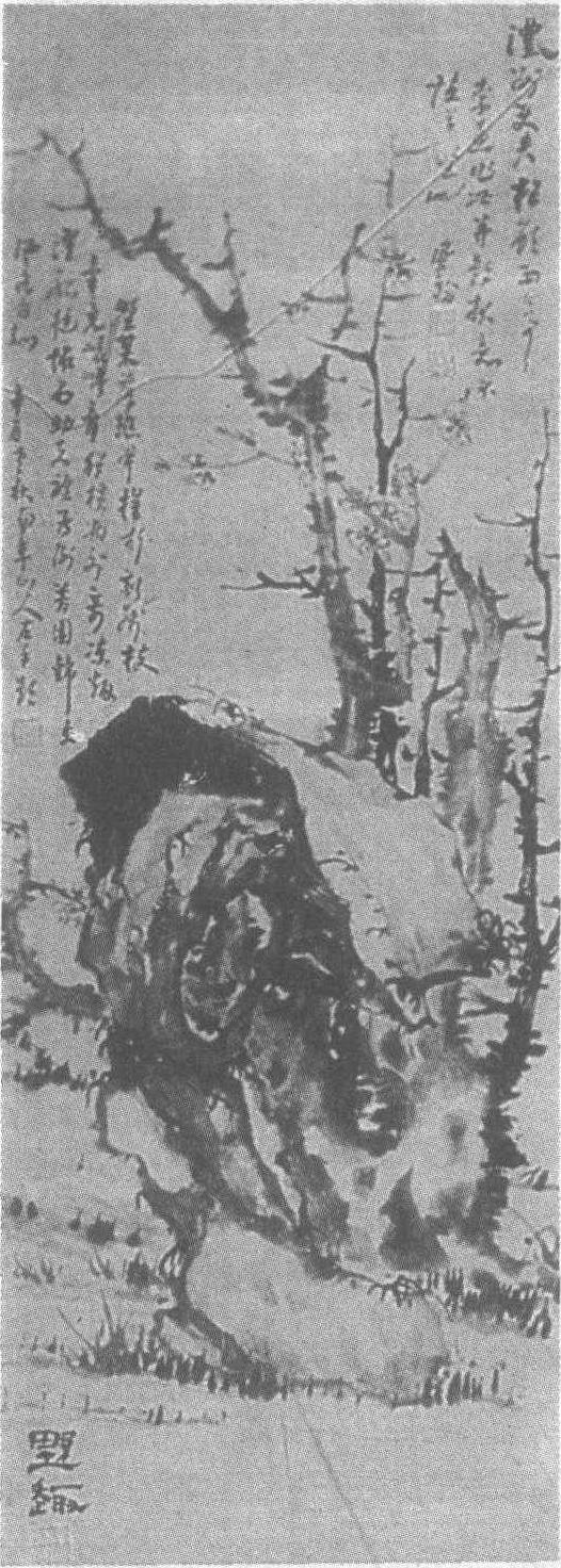 | 释义 | 高凤翰野趣图轴清。高凤翰(见《高凤翰山水图册》条目)绘。纸本墨笔。纵123厘米,横45厘米。山东省博物馆藏。此幅画奇石兀立,石后寒梅数株,花朵疏落。黑色润而不薄,老而不滞,处理得恰到好处。用笔刚柔清劲,纵横恣肆,勾勒皴擦,意到笔至,一气呵成。整幅作品气势磅礴,充满奇逸野韵。画面上方左右题识与梅石浑然一体,相得益彰。左下方又以隶体自题“野趣”二字,老辣凝重,与画风相谐,似为点睛之笔。款署辛酉,即公元1741年。高氏晚年多作写意,并能自出新意,此幅画虽充满苦寒之气,却给人一种挺拔向上、刚正倔强之感。