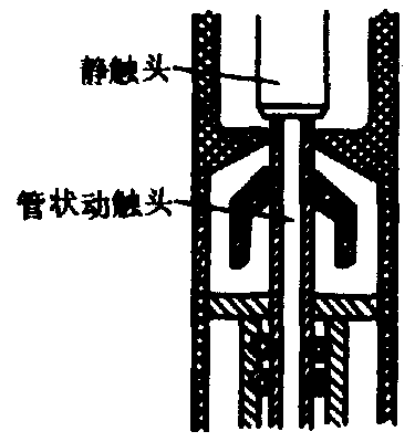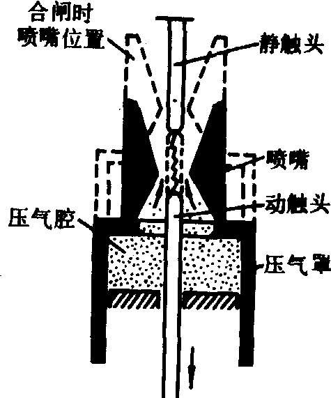 (b)分闸过程 图4 油环吹灭弧室结构原理示意 压缩空气灭弧装置 利用2~4兆帕的压缩空气吹动电弧的灭弧装置。分为横吹和纵吹两类,纵吹灭弧室(图5)又可分为单向内吹、双向内吹和外吹三种方式。 六氟化硫气体灭弧室 利用六氟化硫(SF6)气体吹动电弧的灭弧装置。SF6气体绝缘强度高,高温下分解吸收热量使电弧冷却,其电气强度恢复速度快,灭弧性能好。装置分为单压式、双压式、旋弧式和自吹式几类。单压式又分为定喷口(定开距)和动喷口(变开距)两种。单压式动喷口灭弧室(图6)在开断过程中利用触头与压气罩的运动,产生气流吹动电弧。双压式灭弧室用于早期的六氟化硫断路器,根据六氟化硫气体的压力分为高压区和低压区。分断过程中控制阀门使高压区的六氟化硫气体流向低压区吹动电弧。旋弧式灭弧室利用电磁力使电弧高速旋转冷却而熄灭。自吹式灭弧室利用电弧能量加热气体建立吹弧压力。旋弧式与自吹式灭弧室均属自能式。