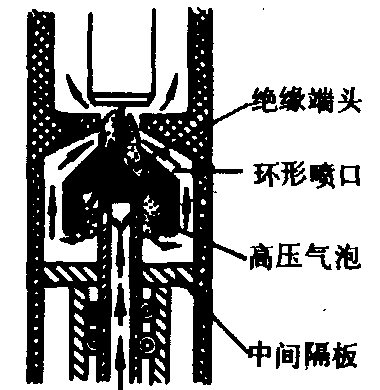 开关电器灭弧装置 用于熄灭因开关断开电流时形成电极电子发射、碰撞游离和热游离所产生的电弧。主要有以下装置: 油吹动灭弧装置 利用电弧本身的热量,使绝缘油分解,产生高压的油、气流,吹动电弧使之熄灭的装置。有:❶油纵吹灭弧室,灭弧过程如图2所示; ❷油横吹灭弧室,灭弧过程如图3所示; ❷油环吹灭弧室,灭弧过程如图4所示。管状的动触头侧面有孔,端部镶有绝缘,当它向下运动时产生电弧;绝缘端头将环形喷口中间圆孔堵塞并把高压气泡分隔成两部分,下部气泡使油流喷向环形喷口;向下移动的动触头又迫使油箱中的油经动触头内腔、侧面小孔喷向电弧区,加强灭弧效果。