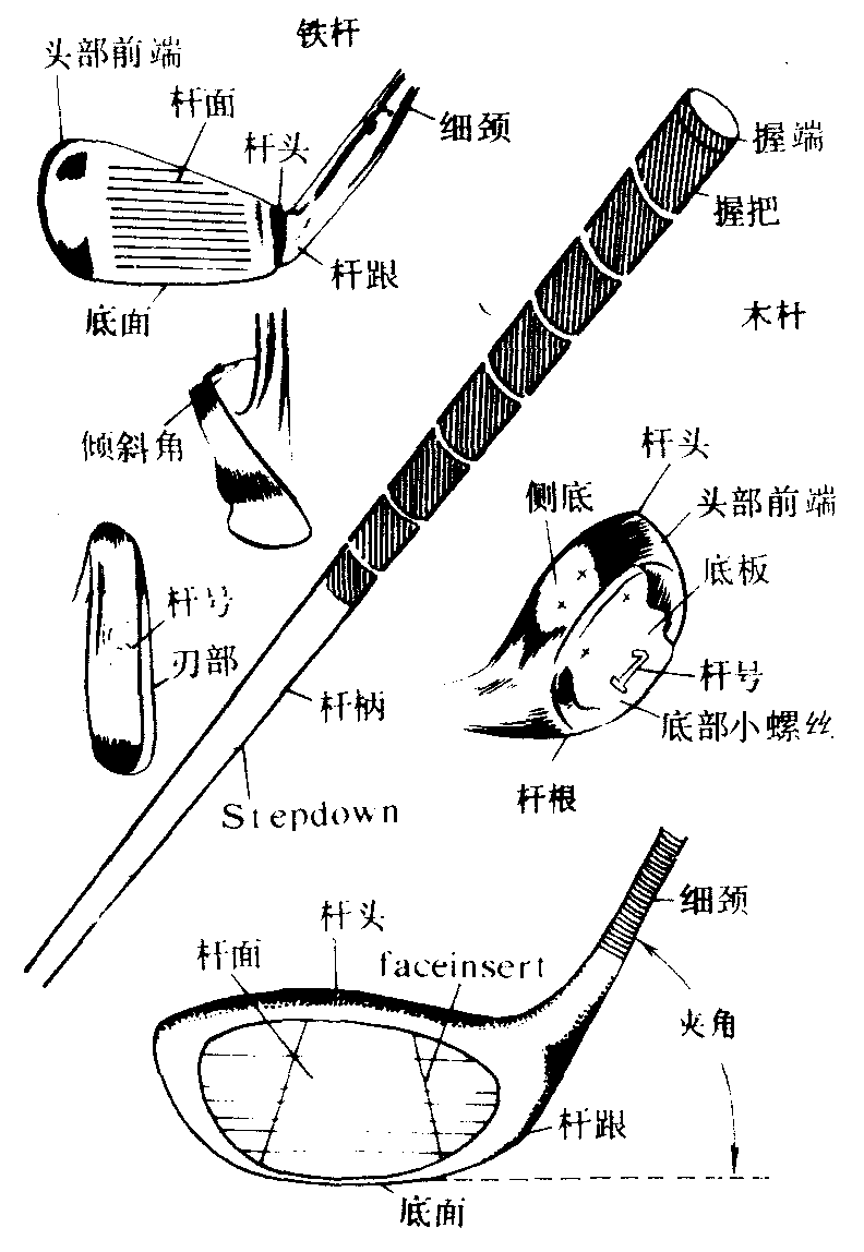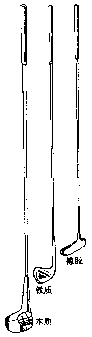 | 释义 | 高尔夫球与球杆球是在一块压缩的小橡皮上,用橡皮筋将其环绕成圆球形,外面再包上有微凹坚硬的合成材料为外壳。直径不小于4.16厘米,重45.93克。球杆:具有多种,长0.91米至1.29米不等,多用木质或塑料与金属涂合制成。它分铁头推击棒杆与不同斜度的弯头击球棒杆。比赛时,每个运动员需备球杆14根,其中木头棒杆5根,铁头棒杆9根。届时铁头棒杆除作为推击时使用外,其余根据将球击远击近、击高的不同需要而分别使用。(见图2—3—70,2—3—71)
