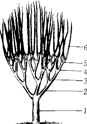 高干桑养成法 1.主干50cm 2. 第一支干30 ~ 40cm 3. 第二支干20~30cm 4. 第三支干20~30cm 5. 第四支干10~15cm 6.枝条 |