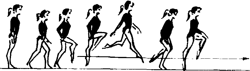 教学重点 原地高抬腿练习, 然后在柔软跑基础上, 逐步把腿抬高, 基本掌握后可加上手臂动作。 |