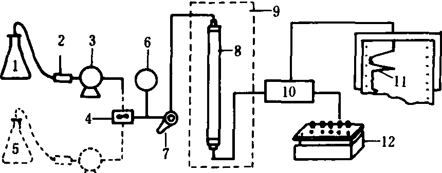 仪器 使用的仪器为高效液相色谱仪,主要由高压泵及输液系统、色谱柱和检测器等部件组成。 高压泵及输液系统 该系统的作用是保证流动相正常工作,它由贮液瓶、脱气装置、高压泵、程序控制器(即梯度装置)及阻尼装置等组成。高压泵应有较高的输出压力和较大的流量调节范围,应使流动相(洗脱液)液流恒定、无脉动。高压泵的种类有机械注射泵、机械往复泵、气动放大泵等。在泵后装上阻尼装置可得到更平滑的流量。程序控制器的作用是进行梯度洗脱,即在分离过程中按一定的程序连续改变流动相的组成,梯度洗脱可提高分离效率和加快分析速度。脱气装置的作用是在洗脱液中通入氮气或氦气,除去洗脱液中的气体,防止气体对检测带来影响。 色谱柱 是直接关系到分离效果好坏的核心部件。一般采用内径2~5毫米的不锈钢柱,通常为直形,其长度为25~150厘米。柱接头要求密封耐压。为得到均匀填充床,管内壁需仔细抛光。也可采用玻璃柱,但耐压较低。作为固定相的柱内填充物为粒度很细的能承受高压的高效填料。常用的固定相有硅胶、氧化铝等吸附剂,涂于惰性担体上的难挥发液体、化学键结合物质、离子交换树脂、凝胶等。 检测器 用于检出柱流出物的成分。最常用的检测器有:❶紫外检测器。利用被测组分对紫外光的吸收进行检测,可分为固定波长和分光两种。 ❷差示折光检测器。利用纯流动相和含有被分析组分的流动相之间折光率的差别进行检测,是一种通用型检测器。由于折光率随温度变化,检测器必须恒温。 ❸荧光检测器。利用有些物质在紫外光照射下能发出荧光进行检测,有很高的灵敏度和选择性。此外,尚有电化学检测器、电导检测器、火焰离子化检测器、红外检测器、质谱检测器等。 特点 ❶分析对象广。适宜于分析气相色谱法无法分析的大量不易挥发性物质、热不稳定性物质及分子量在300以上的高分子类物质。因而在农业和生物学等领域里,许多活性物质(如生长素、昆虫激素等)以及高分子物质(蛋白质、核素、酶等)均可采用高效液相色谱法在常温下进行分离分析。 ❷高效高速。由于采用了高压输液泵(压力可超过40 530千帕)及高效色谱柱(固定相粒度细至几个微米),分离效率高,分析速度可在几分钟至半小时左右完成。采用梯度洗脱程序可进一步提高分离效率,可分离结构稍有差异的同系物或异构体。 ❸定性方便。可通过与光谱及质谱联用,在仪器上直接定性;也可通过组分收集器,将收集到的各组分在其他仪器上定性。 ❹选择余地大。可针对不同的分析物质,选择不同的流动相、固定相和检测器,以求得最佳的分离分析效果。在液-液分配色谱中,可通过选择不同极性的流动相和固定相,来分析具有不同极性的化学物质。通常,使用极性固定相和非极性流动相的称为正相色谱,使用非极性固定相和极性流动相的称为反相色谱。 ❺从总体上讲,其分离效果、检测器的检测范围及灵敏度等方面尚不及气相色谱。有时可采用化学衍生法弥补,即在色谱柱前或柱后与某种试剂在一定条件下进行化学反应,使反应的衍生物有利于分离与检测。 应用 高效液相色谱法在农业上有广泛的应用。可利用离子交换色谱分离分析氨基酸、维生素、核酸、生物碱、无机金属离子及阴离子等;利用液固吸附色谱、液液分配色谱分离分析核酸、维生素、糖类化合物、脂类化合物、类固醇、激素、黄曲霉素、香豆素、有机氯农药、有机磷农药、氨基甲酸酯农药及除草剂等;利用空间排斥色谱(凝胶渗透色谱)分离分析蛋白质等。 高效液相色谱法high performance liquidchromatography,HPLC以液体为流动相,液体或固体为固定相,由高效分离柱,高压输液泵和高灵敏度检测器组成的液相色谱法。(见彩图55)