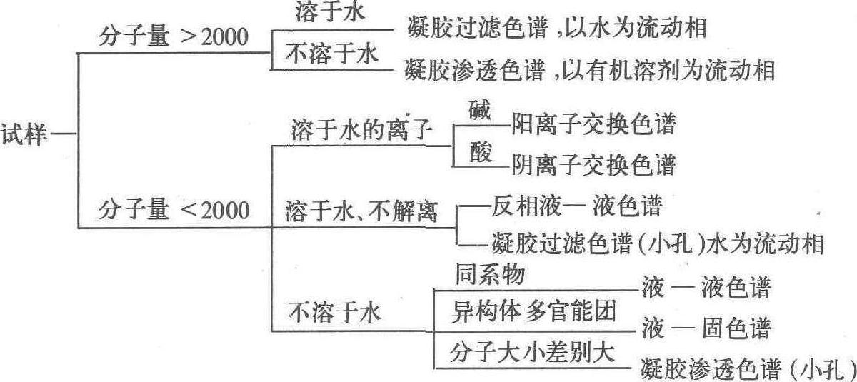 ❷梯度洗脱装置:是高压输液系统的组成部分之一。梯度洗脱,就是流动相中含有两种以上不同极性的溶剂,在分离过程中按一定顺序连续改变流动相中溶剂的配比和极性,通过极性的变化来改变被分离组分的分离因素,以提高分离效果、缩短分离时间,增加分辨能力,改善峰形,从而提高最小检出量。 ❸进样器:是把分析样品送入色谱柱的部件。在高效液相色谱中进样方法有三种:注射器法;环阀法;万能阀法。 ❹色谱柱:是将杂质和样品各组分进行分离的部件。是高效液相色谱仪最重要的部件,大都采用内径为1~6毫米内壁抛光的不锈钢管,长度一般15~50厘米。液相色谱法的装柱是一项技巧性很强的技术,装填质量对柱效影响显著。 ❺检测器:是将样品各组分和其量的变化连续地转换为易测量信号的部件。一个理想的检测器应该具有灵敏度高、重现性好响应快、线性范围宽、应用范围广、对流量和温度的变化不敏感等特性。但目前还没有一种很理想的HPLC检测器。目前商品仪器中应用最广泛的检测器是紫外检测器(UV)、示差折光检测器(RI)、荧光检测器(FD)。 分类 高效液相色谱法可分为四类。 液—液分配色谱法 流动相和固定相都是液体的液相色谱法。样本组分在互不相溶的两种液相中分配系数不同,得以实现分离和分析。流动相和固定相为两种互不相溶的液体,两者之间有一个明显的分界面,流动相流经色谱柱时,很大面积上与固定相接触,流动相中的样品组分,在两相之间,很快进行平衡分配,由于它们在两相之间相对溶解度的差异,以不同速度流经色谱柱,从而得到分离。在液—液分配色谱中,根据流动相和固定相相 极性不同,又分为正相分配色谱和反相分配色谱。以强极性亲水性物质或溶液为固定相,非极性、弱极性或亲脂性溶剂为流动相称为正相分配色谱,反之称为反相分配色谱。液—液分配色谱所用固定相有两种:❶物理涂渍的固定相。常用的极性固定液为;β,β′-氧二丙腈、聚乙二醇等;非极性固定液为:正十八烷、异三十烷等。其缺点是因固定液的流失,很难长时间维持其化学性能。 ❷化学键合固定相,即把固定液化学结合在载体表面上的固定相。其特点为:❶表面没有液坑,比一般液体固定相传质快得多; ❷无固定液流失,增加了色谱柱的稳定性和寿命; ❸可以键合不同官能团,能灵活地改变选择性; ❹有利于梯度洗脱,也有利于配用灵敏的检测器,能适应多种色谱体系,广泛用于各种样品的分离。液—液色谱流动相,系根据极性大小进行选择,常用流动相,按极性由大到小顺序排列如下:水、乙腈、甲醇、乙酸、乙醇、四氢呋喃、乙酸乙酯、二氯甲烷、苯、四氯化碳、正已烷。这种色谱的特点为:❶再现性能非常稳定; ❷分离适用性广,从非极性化合物到极性化合物,都可以作其分离对象; ❸能做高精度定量分析。 液—固吸附色谱法 流动相为液体,固定相为吸附剂的液相色谱法。样本中各组分因对固定相表面吸附作用的差异,得以分离和分析。色谱柱内充填固体吸附剂,利用吸附剂表面活性中心进行吸附,试样不进入固定相内部。流动相带着被测组分进入柱子时,吸附剂不仅对不同的组分具有不同的吸附力,而且对流动相分子也具有一定的吸附作用,在吸附剂表面各组分分子之间及各组分分子与流动相分子之间发生吸附竞争。保留值由这两种因素所决定。液—固色谱固定相(吸附剂)可分为极性和非极性两类。极性的为:硅胶、氧化铝、氧化镁、分子筛等;非极性的主要为活性炭,因机械稳定性差很少使用。液—固色谱流动相,系利用溶剂强度参数来选择适当极性的溶剂,常用溶剂按溶剂强度参数由小到大顺序排列为:异辛烷、四氯化碳、二甲苯、苯、氯仿、四氢呋喃、乙酸乙酯、乙腈、吡啶、乙醇、乙酸、水等。液—固吸附色谱法的特点为:❶适合可溶于有机溶剂的非离子型化合物的分离,特别是异构体及具有极性不同的取代基的化合物的分离; ❷吸附剂重复性差,故柱稳定性不好; ❸样品组分吸附在吸附剂之活性部位有变质和损失的可能。 离子交换色谱法 根据离子交换的原理进行分离的液相色谱法。基于作为固定相的离子交换剂(薄膜型离子交换树脂和离子交换键合固定相)上可电离的离子,与流动相中具有相同电荷的溶质离子进行可逆交换,依样品中不同组分的离子对交换剂具有不同的亲合力而将其分离。离子交换色谱法固定相,主要有以下类型:❶微粒树脂型; ❷表面多孔型; ❸硅胶键合相多孔微粒。❶~ ❸骨架基体上可引入各种离子基团,或涂渍、键合有机离子交换剂。流动相多采用在水溶液中含有一定离子强度的缓冲液,或与水混溶的有机溶剂。如:甲醇、乙醇、乙腈、二氧六环等。离子交换色谱法特点为:❶多数情况对离子的分离有效,至少要部分离子化的化合物方可用此法; ❷除离子交换外,还可能有吸附和分配作用; ❸离子交换剂每批产品间性能不重复。 凝胶色谱法 依据分子大小顺序而分离的液相色谱法。用化学惰性的具有网状结构的多孔性物质作固定相,试样组分按分子大小构形进行分离。也称排阻色谱法,是四种液相色谱法中最新的一种。其作用近似于分子筛效应:试样进入色谱柱后,随流动相在凝胶外部间隙及凝胶孔穴旁流过,体积大的分子不能渗透到凝胶孔隙里去,而较早地被淋洗出来。中等体积分子产生部分渗透作用。小分子可以